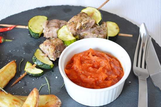 Schweineschaschlik mit Ofenpommes und Karotten-Ketchup